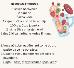 Učenici su kroz igru i praktične izvedbe spoznali važnost pravilne prehrane za zdravlje, energiju i koncentraciju te razvili kritički odnos prema trendovima u prehrani na društvenim mrežama. Na kraju sata počastili smo se zdravim uratkom voćnog smoothieja koji su nam pripremili i poslužili učenici 2.c razreda, a koji možete i vi isprobati. U slast!